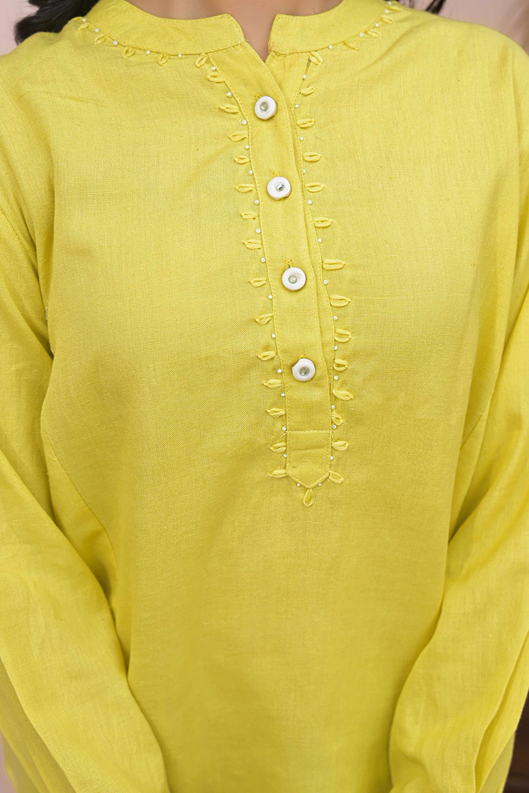 Lemon Yellow colored top is fashioned on muslin fabric which is lightweight and assures the wearer a perfect fit & comfort